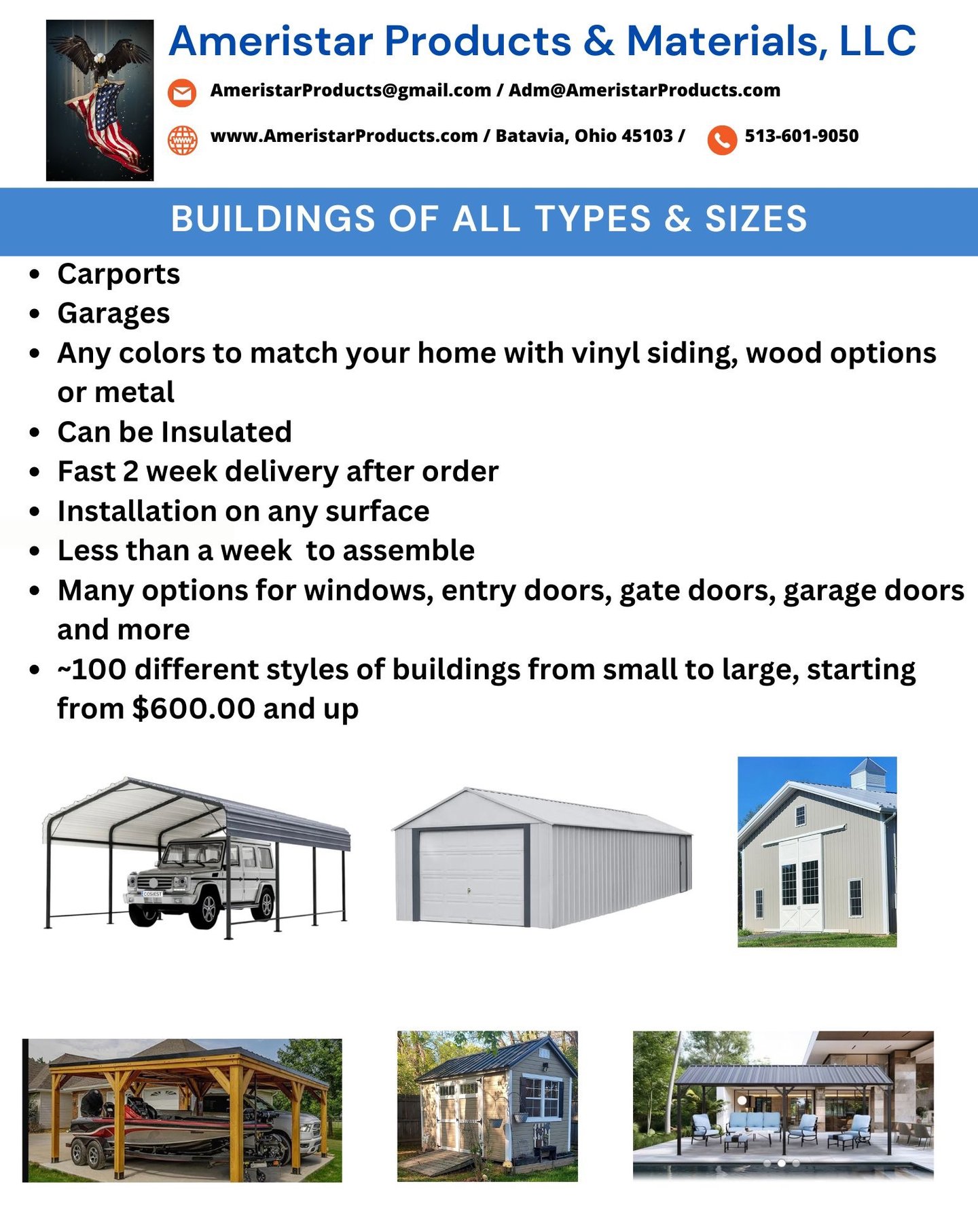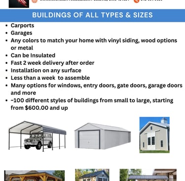 We have ~100 different styles of buildings from small to large. Starting from $600.00 and up..